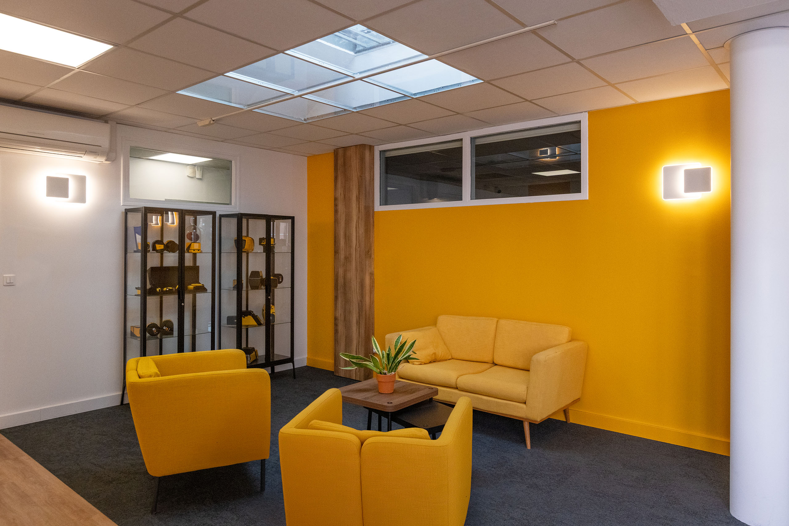 L’objectif principal de YellowScan était de transformer ces espaces en lieux plus conviviaux et chaleureux, tout en les rendant modulables afin de pouvoir accueillir des réunions réunissant un plus grand nombre de collaborateurs. La conception a également été pensée dans le strict respect de la charte graphique et des couleurs de l’entreprise, afin de garantir une cohérence avec son identité.